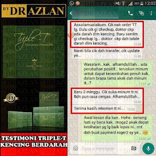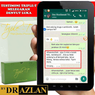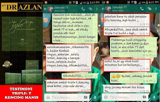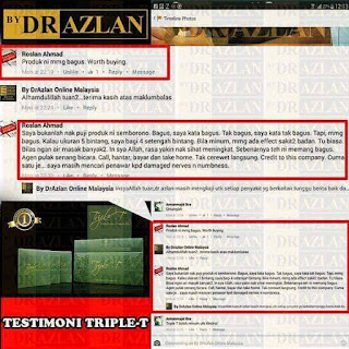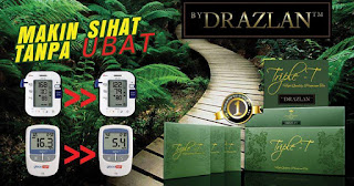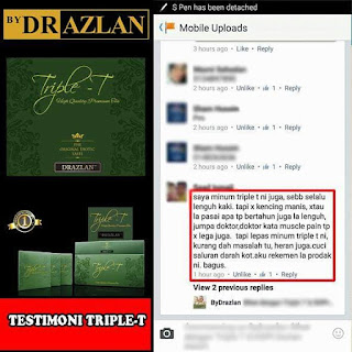 "Tuan.. sy mencuba Triple-T byDRAZLAN setelah saya keluar dari wad pantai puteri ipoh Perak. Masalah saya ialah kencing manis bacaan 42.. darah tinggi 230/150, akibatnya ...pendengaran jadi pekak, mata kabur, jantung bengkak dan buah pinggang hanya berfungsi 45%. Dah lebih sebulan saya amalkan TT. Stakat saya amalkan sampai harini semua terkawal walau x bergantung dengan ubat hospital.. lupa tuan. Kolestrol saya dah turun ke 7.6.. "